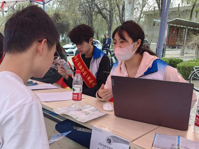 4月7日,商学院(质量学院)于东校区逸夫图书馆南校训石前开展“莘莘商院学子,志愿服务奉献,西部建功立业,共赴青春之约”2024年大学生志愿服务西部计划招募咨询会。商学院(质量学院)团委书记刘玉华到招募现场进行指导。
