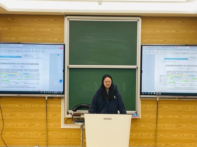 徐佳祺围绕《环境规制对黄河流域上市公司绿色技术创新的影响》一文进行分享,她提到,该论文基于核密度估算法测算了黄河流域上市公司的绿色技术创新水平,并利用空间误差模型(SEM)深入分析了正式环境规制和非正式环境规制的影响,明确了黄河流域整体绿色技术创新水平的发展趋势及变化特征,为同学们提供深入了解黄河流域绿色技术创新发展新视角的同时,也有助于激发同学们对环境规制与绿色技术创新关系的进一步思考。