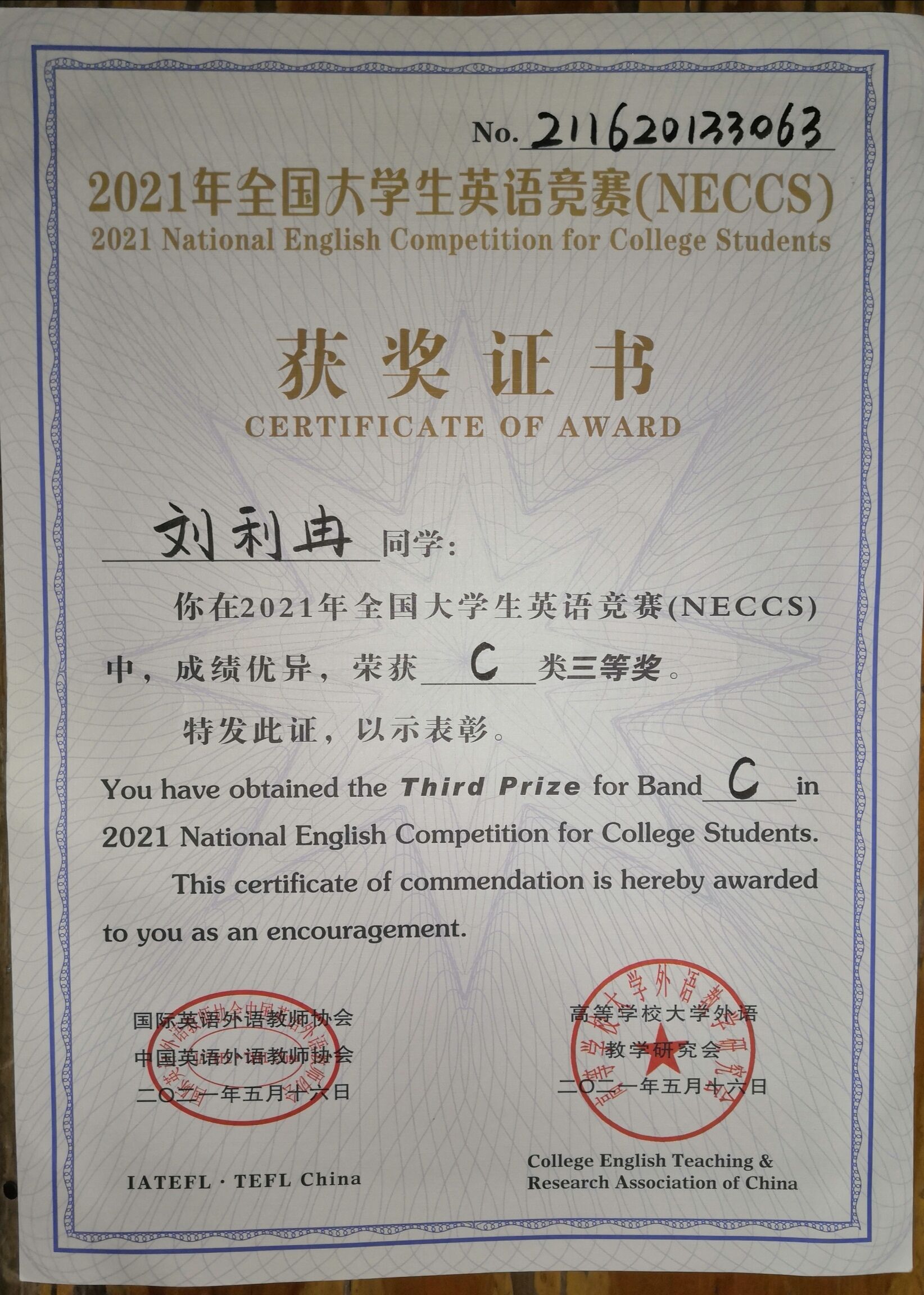 刘利冉于2021年5月16日荣获2021年全国大学生英语竞赛c类三等奖