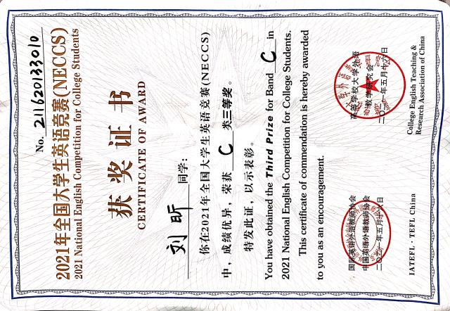 刘昕于2021年5月16日荣获2021年全国大学生英语竞赛c类三等奖