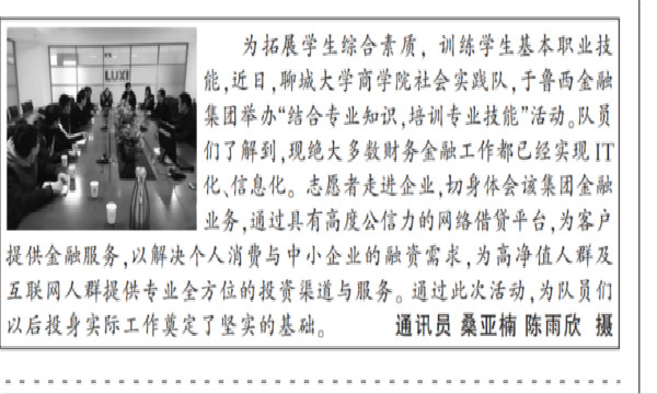 为拓展学生综合素质,训练学生基本职业技能,近日,必赢bwin线路检测中心社会实践队,于鲁西金融集团举办“结合专业知识,培训专业技能”活动。志愿者了解到,现绝大多数财务金融工作都已经IT化、信息化。志愿者走进企业,切身体会该集团金融业务,通过具有高度公信力的网络借贷平台,为客户提供金融服务,以解决个人消费与中小企业的融资需求,为高净值人群及互联网人群提供专业全方位的投资渠道与服务。通过此次活动,为队员们以后投身实际工作奠定了坚实的基础。