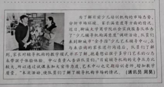 为了解目前少儿培训机构的市场态势,分析市场环境、家长满意度等方面的情况。近日,必赢bwin线路检测中心社会实践服务队举办了“少儿辅导机构满意度”调研活动。队员们来到聊城市“金手指”少儿艺术辅导中心,在与来咨询的家长进行沟通后,队员们了解到,家长对辅导机构的教学模式并不了解,抱着想让孩子多学门艺术的心态来带孩子体验体验。中心负责人告诉队员们:“目前辅导机构的竞争压力比较大,所以通过试课来加大宣传力度,艺术中心也定期培训老师,增加教学质量。”本次活动,使队员们了解了辅导机构市场的情况。(通讯员周昊)