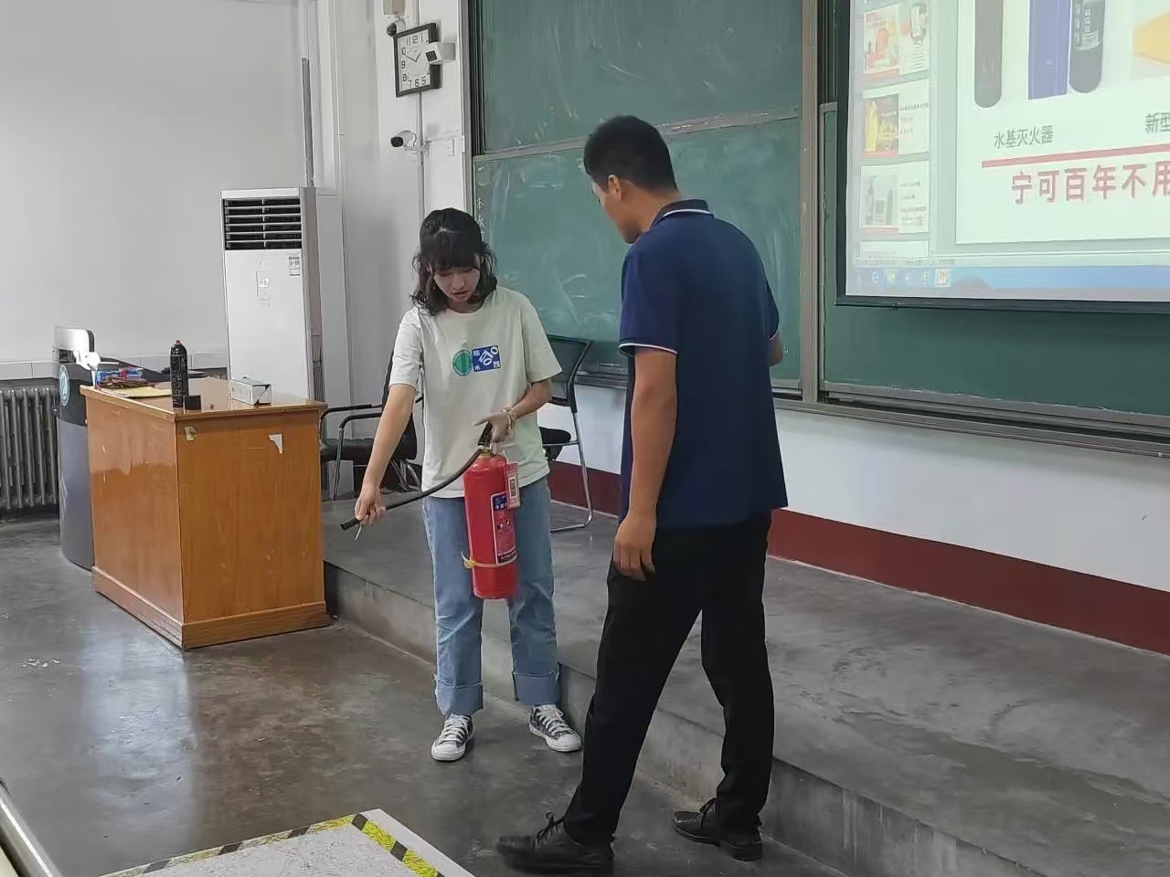 在实操演练环节,主讲人演示了灭火器的正确使用方法、步骤和灭火姿势等,并邀请学生现场体验。活动最后,辅导员王高平指出,同学们应积极树立消防安全意识,时刻保持警惕心理,防患于未然,努力创建平安校园。