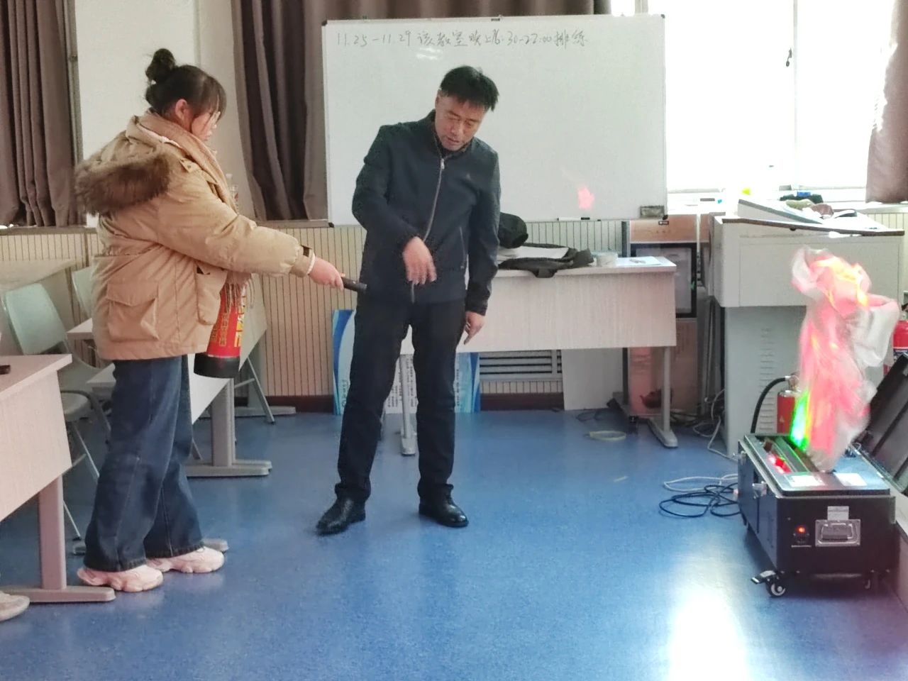 为提高同学们的消防安全意识和自救自护能力,营造安全和谐的校园环境,11月22日,商学院(质量学院)于东校区1#301、6#A106组织开展消防安全培训及仿真灭火器现场操作演练活动,本次演练邀请学校党委保卫工作部(安全保卫处)马国栋、马飞担任主讲人,2024级全体新生参与。
