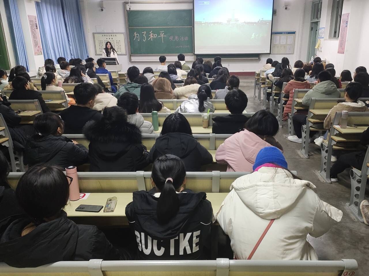 报君黄金台上意,提携玉龙为君死。为了提高学院同学们的政治思想觉悟,激发同学们强烈的爱国主义热忱。11月22日,商学院在东校区1#301举行办《为了和平》观影活动。