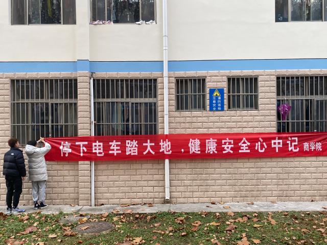 道路千万条,安全第一条。活动组织者提前准备好与交通安全有关的横幅,分别布置在教学楼及宿舍楼附近,为同学们营造一个平安的校园氛围。同时也响应“绿水青山就是金山银山”的口号,创建低碳环保校园环境。“少骑电车多走路,健康御寒少事故”倡议同学们停下电车,健康出行,减少交通事故的发生。“停下电车踏大地,健康安全心中记”在校园中也需要遵守交通规则,牢记安全意识,降低电车出行率。“快乐步行你我他,身体健康学习棒”步行是锻炼身体最好的方式,只有身体健康,学习才会得到保障,自身才能更加全面发展。活动也在讲解中逐渐接近了尾声。