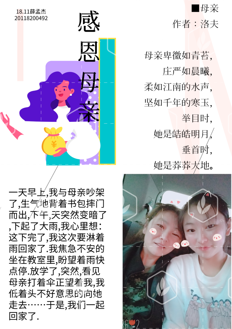 活动伊始,活动负责人向参赛同学介绍了有关制作作品的相关要求,让参赛者对此次活动有了更进一步的了解。同时负责人号召同学们回忆自己与母亲相处时的点点滴滴,感悟母亲在自己成长路上所起到的作用。作品制作过程中,学子们翻阅了自己的相册,借助照片回忆起了自己曾经做过的令妈妈感动的事,母亲给予的感动和温暖以及母亲为了使自己更好的成长所做出的改变。在搜集好素材之后,同学们将其制作成精美的手抄报,并上交至相关负责人。活动负责人收集到同学们的作品之后,进行了整合汇总,并分享给了老师。活动最后,同学们纷纷表示自己要尊重母亲、爱护母亲、存孝心、尽孝道。