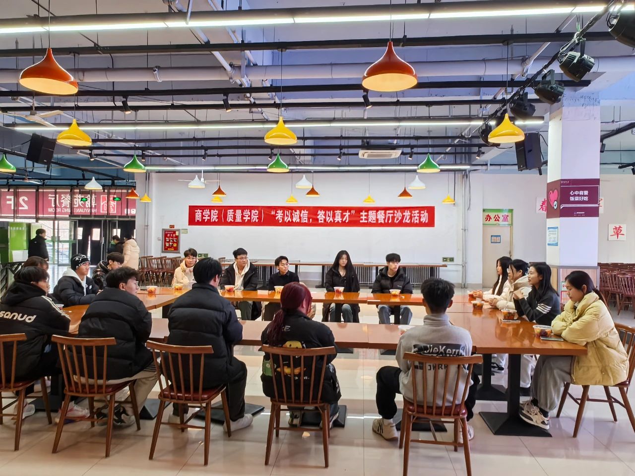 为严肃考风考纪,规范考试秩序,引导学生筑牢诚信根基,切实加强优良考风学风建设,维护教育考试的公平公正,12月12日,商学院(质量学院)于东校区翰苑餐厅二楼开展了“考以诚信、答以真才”主题餐厅沙龙活动,学院辅导员施安琪老师和刘聪睿老师结合各类全国性考试以及体育测试中的作弊替考行为,对同学们在考试中出现违纪心理进行分析,让学生从思想上高度重视考纪的严重性。