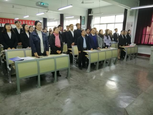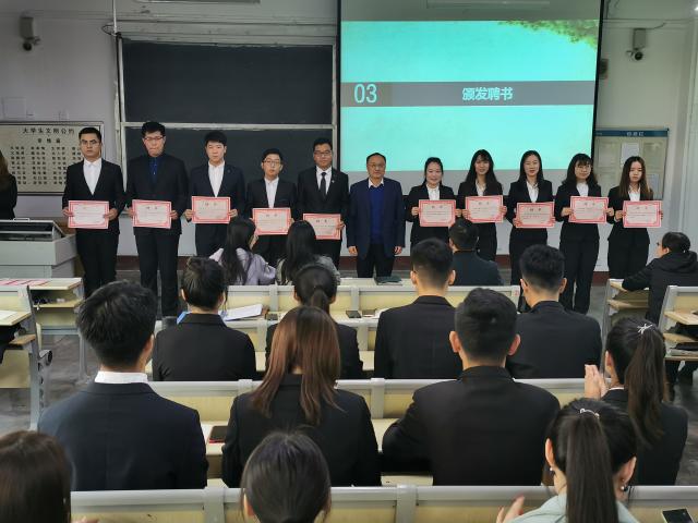 大会开始,全体起立,奏唱国歌。伴着庄严的国歌,2020届商学院学生组织成立大会正式拉开了序幕。在工作人员宣布2020届学生会主席团成员、团委委员及部长聘任决定后,由党总支副书记许杰等老师为其颁发聘书。