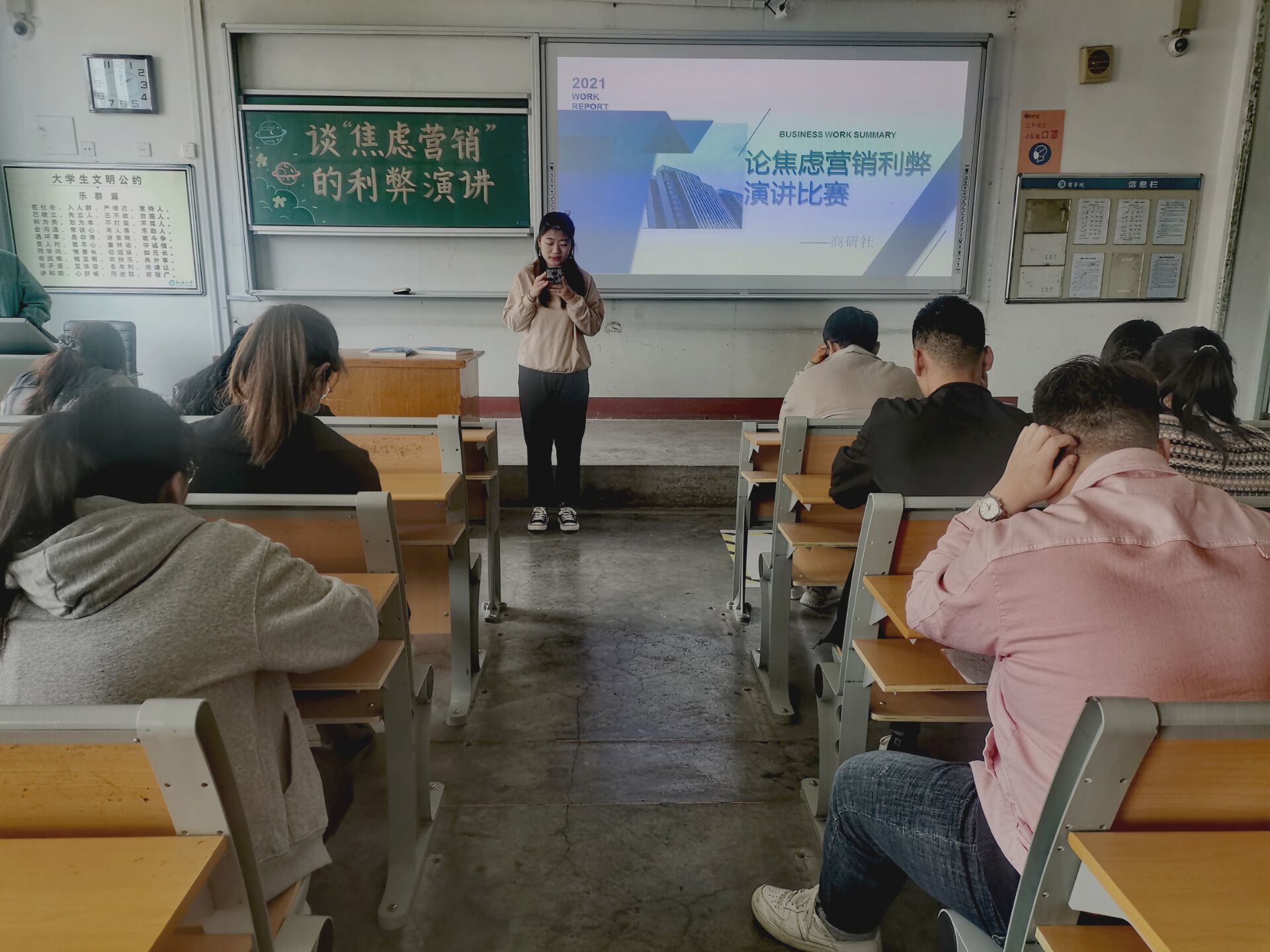 焦虑营销在人们的生活中无处不在,焦虑营销就是针对焦虑进行营销。这类营销通过抓住人的焦虑和痛点,夸大人们的焦虑进行包装和促销。本次活动旨在通过演讲交流,让同学们深入了解焦虑营销对于社会生活的利弊。活动伊始,由主持人对本次演讲进行发言,随后由参赛同学依次上台演讲。大部分同学认为焦虑营销会放大人们的焦虑情绪,滥用人们的性格缺点,用片面化、放大化的手段宣扬人们的不足之处,不利于社会正能量的发展。也有一些同学提出,虽然焦虑营销存在许多弊端,但是它也促进了社会经济的发展,有利于增强市场活跃度,同学们在活动现场进行了思维碰撞,每个人都有着自己独到的见解。待所有参赛同学演讲完毕后,由在场评委对每组进行打分并统计获奖名单,本次活动顺利结束。