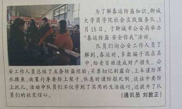 年关将近,春运拉开序幕,然而全国人民皆大欢喜的同时春运防盗不可大意。为了解春运防盗知识,必赢bwin线路检测中心社会实践服务队,1月15日,于聊城市公安局举办“春运防盗安全你我”活动。队员们向公安工作人员了解到,春运时,多数骗子混在其中,给老百姓造成财产损失。公安工作人员总结了五条防盗经验:买票切记别露白、上车谨防浑水摸鱼、放置行李要防上架子、休息时谨防抠死倒、谈话中要防上托儿。活动中队员们学习到了实用的生活技巧,有助于队员们社交信心的提升。(通讯员刘敦正)