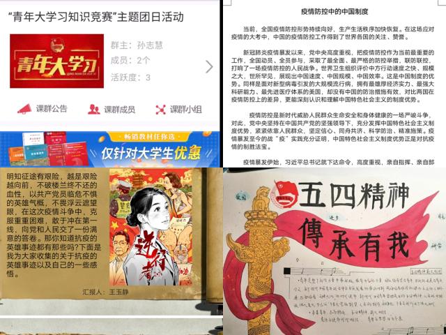 为响应共青团中央的号召,让广大青年加深对于五四精神的理解,更好的传承五四精神,坚定打好疫情防控攻坚战的决心。4月29日至5月1日期间,商学院举办“赞抗疫英雄 讲感人事迹”、“五四精神 传承有我”、“青年大学习”知识竞赛主题团日活动,以及“绽放战疫青春 坚定制度自信”征文活动。