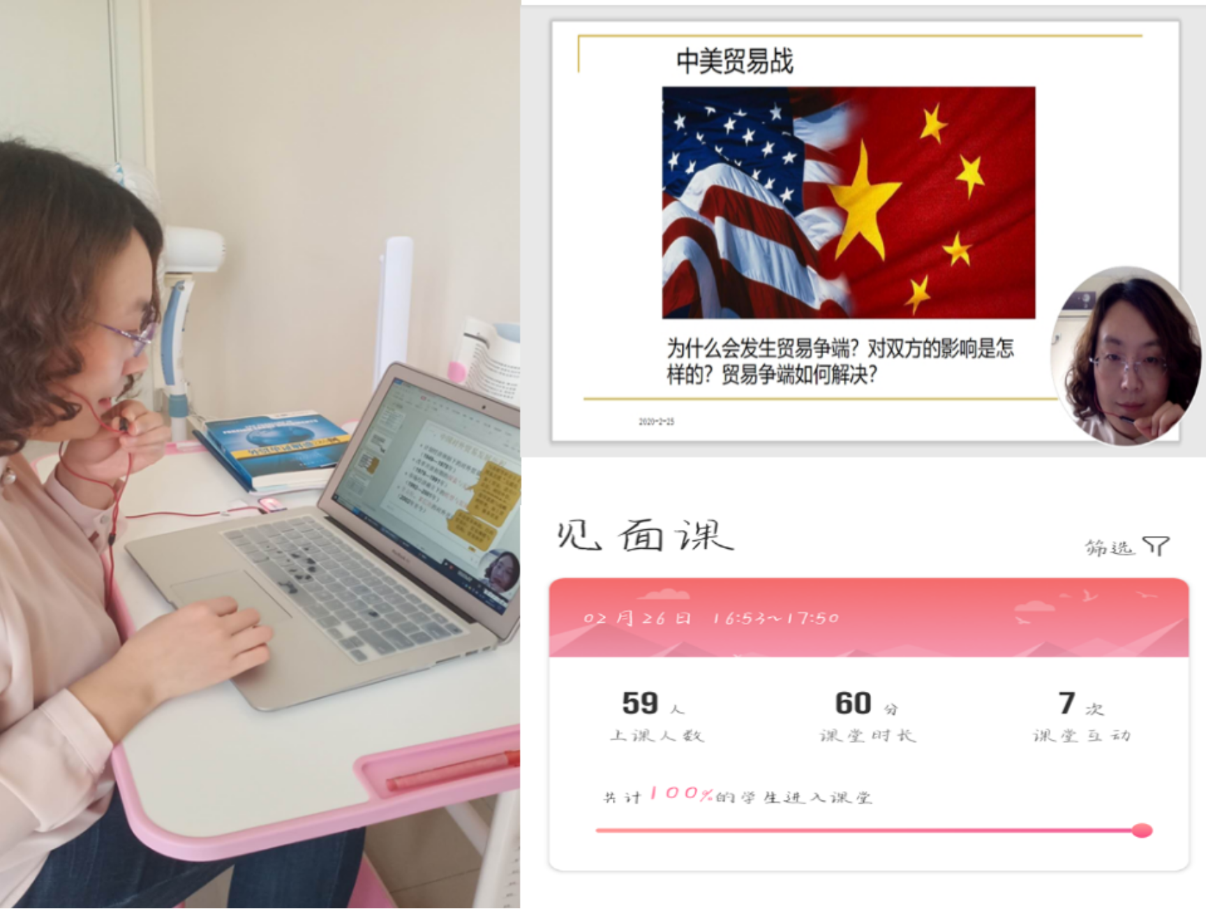 (商学院经济系王歆老师曾获得山东省第五届青年教师教学竞赛二等奖、第五届和第七届必赢bwin线路检测中心青年教师教学竞赛一等奖,曾多次指导学生获得POCIB全国大学生外贸从业能力大赛。此次线上教学期间,王歆老师根据自己所教授的课程特点,将微课、翻转课以及共享课资源结合在一起,在不增加学生下载使用APP数量的情况下,实现了课前预习、课中直播互动、课后作业监督整个教学闭环,使学生虽身居家内,视野却格外宽阔。)