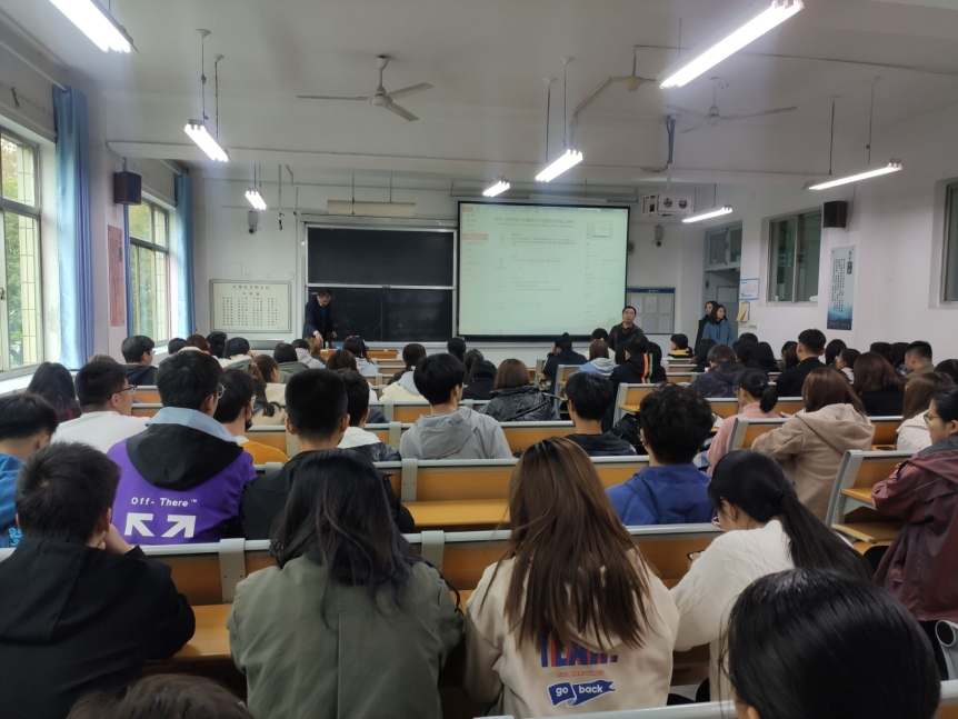 于总经理首先利用宣传片,PPT等方式,详尽地讲解了中通集团的发展史,从初期,成长,后期三个阶段展示了该公司的创业以及成长历程。期间分析了大学生的就业形势,以及影响大学生就业的因素和解决大学生就业的新途径和新思路。主讲人也通过切身感受地利用多个公司事例,主动的分享经验,积极鼓励学生大胆就业,勇于抓住机会,积极迎接挑战,打造更加优质的未来。