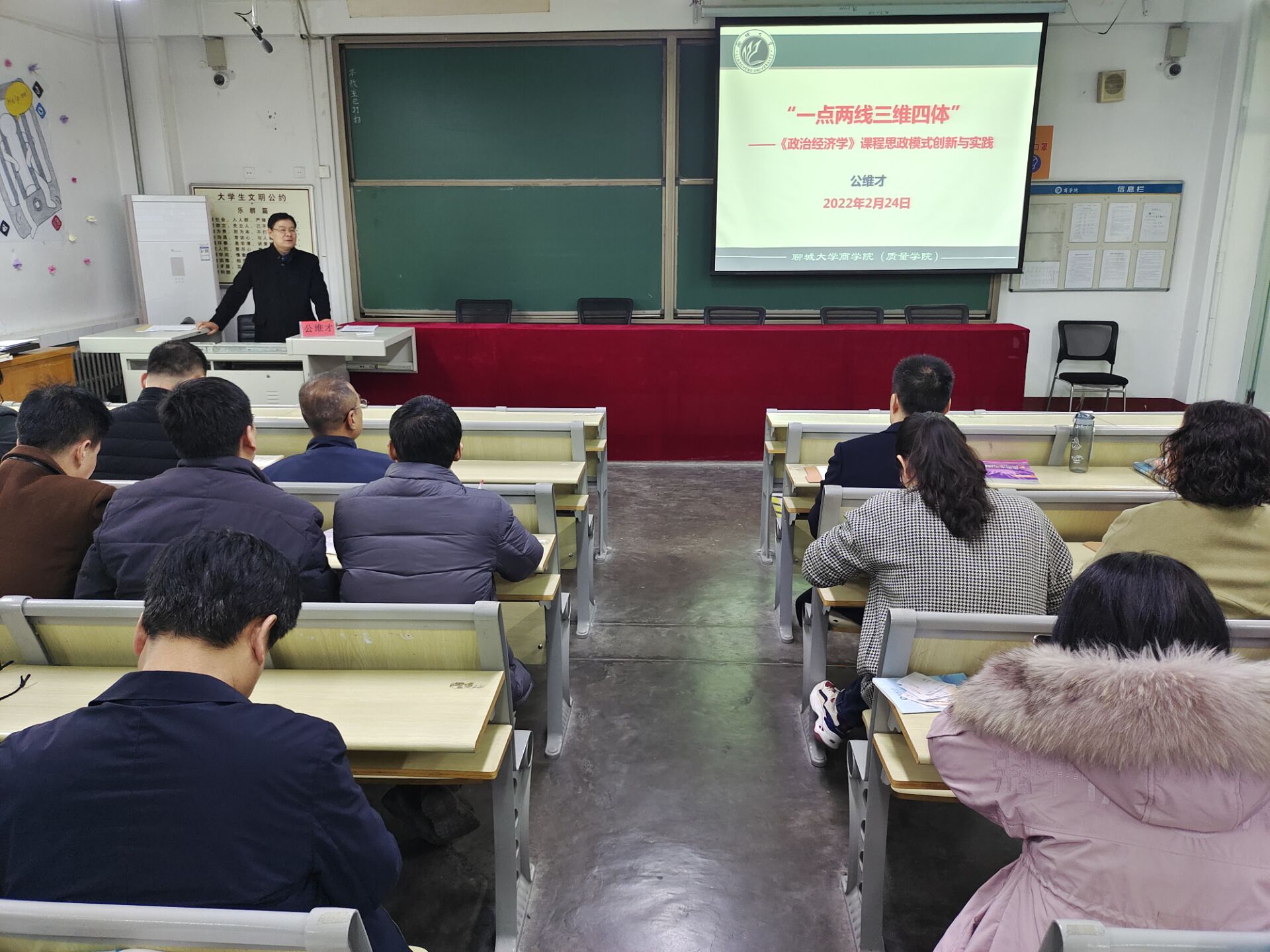 2022年2月24日下午,商学院党委书记公维才结合学院专业特点,为全院教职工和部分学生代表深入剖析了新文科建设背景下课程思政建设的内涵以及模式创新的实现路径。