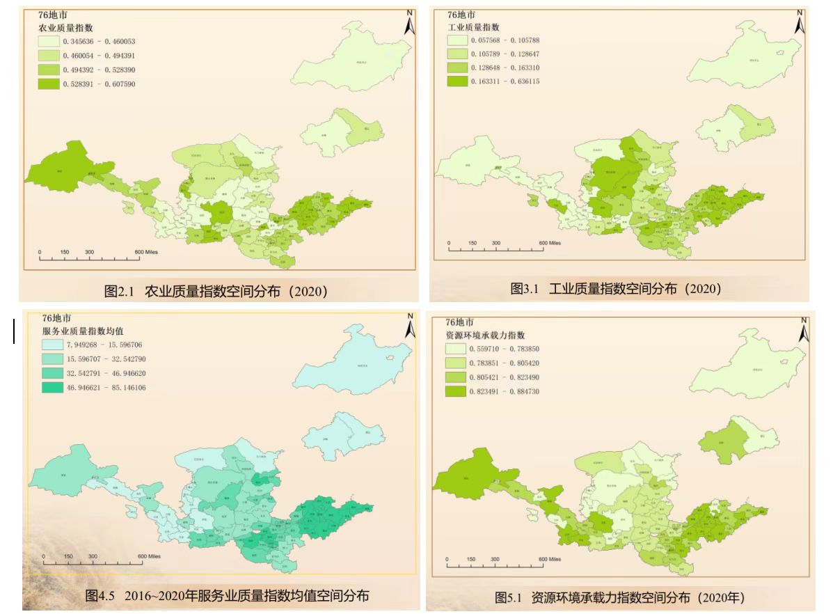黄河流域产业质量指数,采用全局熵值法、层次分析法、组合赋权法三种方法,采用了《中国城市统计年鉴》《中国农村统计年鉴》等9种公开发表的数据,编制范围涵盖黄河流经的青海省、甘肃省、四川省、宁夏回族自治区、内蒙古自治区、陕西省、山西省、河南省、山东省等九个省(自治区),另外在黄河中下游分别选取上游22个地级市、中游25个地级市、下游29个地级市,总计76个地级市作为研究对象。