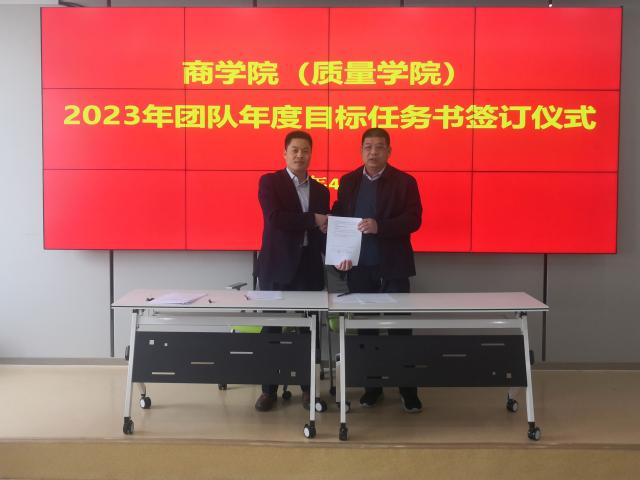 2023年4月6日,商学院(质量学院)2023年揭榜挂帅攻坚团队任务书正式签署。本年度遴选确定了五个科研团队、一个服务社会团队、一个教学团队、一个学科竞赛团队、一个管理案例编写团队,涉及了学院教学、科研、服务社会、学生管理各项工作。为进一步激发学院教学科研人员工作积极性,推动学校工作部署和学院各项工作安排更好更快落地,确保高质量完成学校和学院发展任务奠定了良好基础。