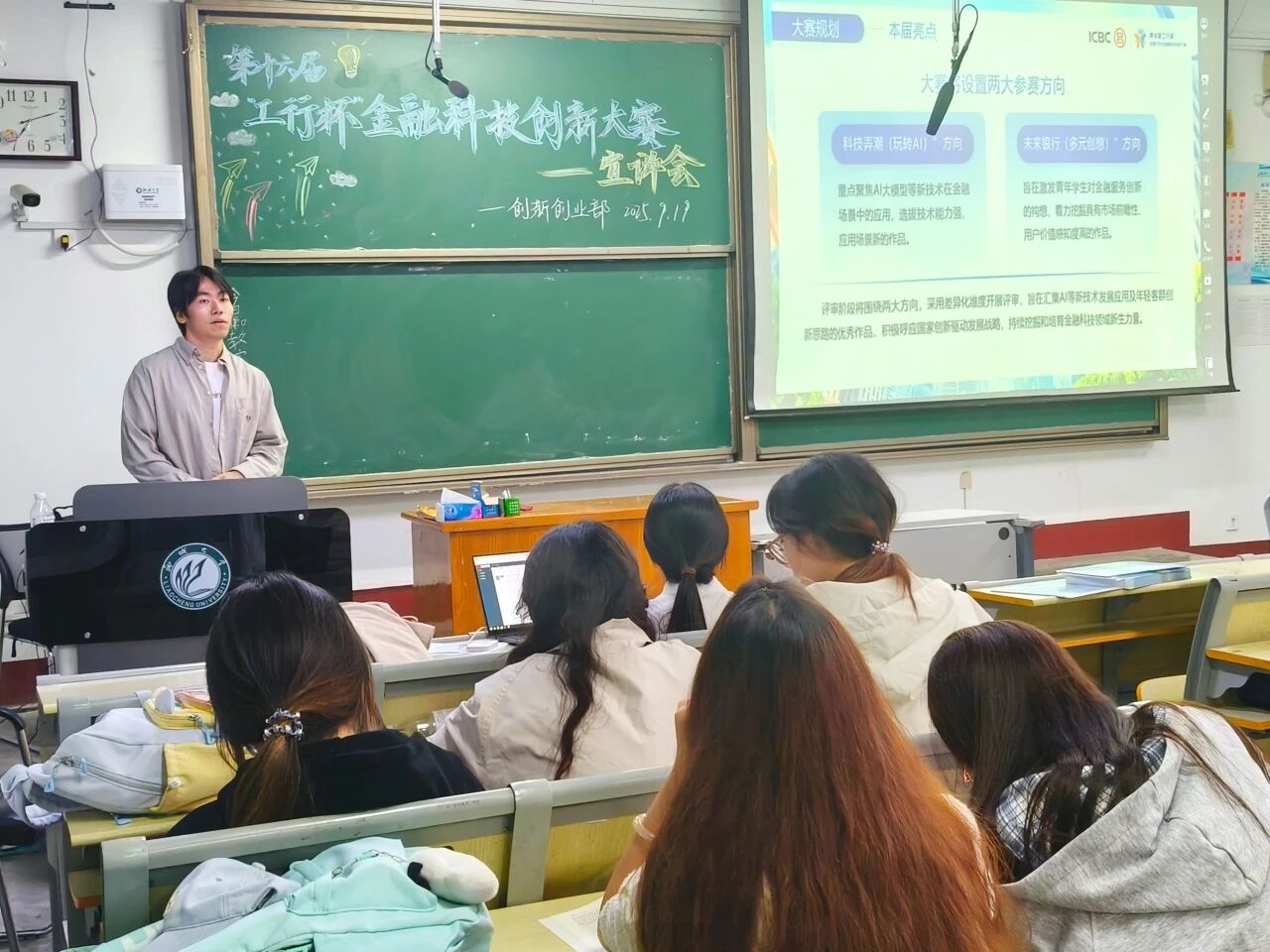 为助力学子把握金融科技创新赛事机遇,激发创新创业活力,9月19日,商学院(质量学院)创新创业部于1号教学楼301室举办第十六届“工行杯”全国大学生金融科技创新大赛宣讲会,聊城分行工商银行金融科技部经理一级孙泽龙、王莹受邀担任主讲人,全方位解读大赛细则。