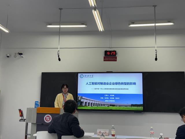 在分论坛汇报环节,刘玉娜代表研究团队就论文的研究背景、理论机制、实证设计、主要结论与政策启示进行了全面清晰地阐述。逻辑严密的汇报内容、翔实的研究数据和前沿的研究方法引发了在场学者的热烈讨论。分论坛点评专家《经济经纬》编辑部副主任郭界秀、河南财经政法大学国际经济与贸易学院院长王洪庆在评价建议中指出,该选题紧扣国家‘双碳’战略与人工智能发展重大需求,实证方法规范,研究结论具有重要的理论创新价值与实践指导意义。