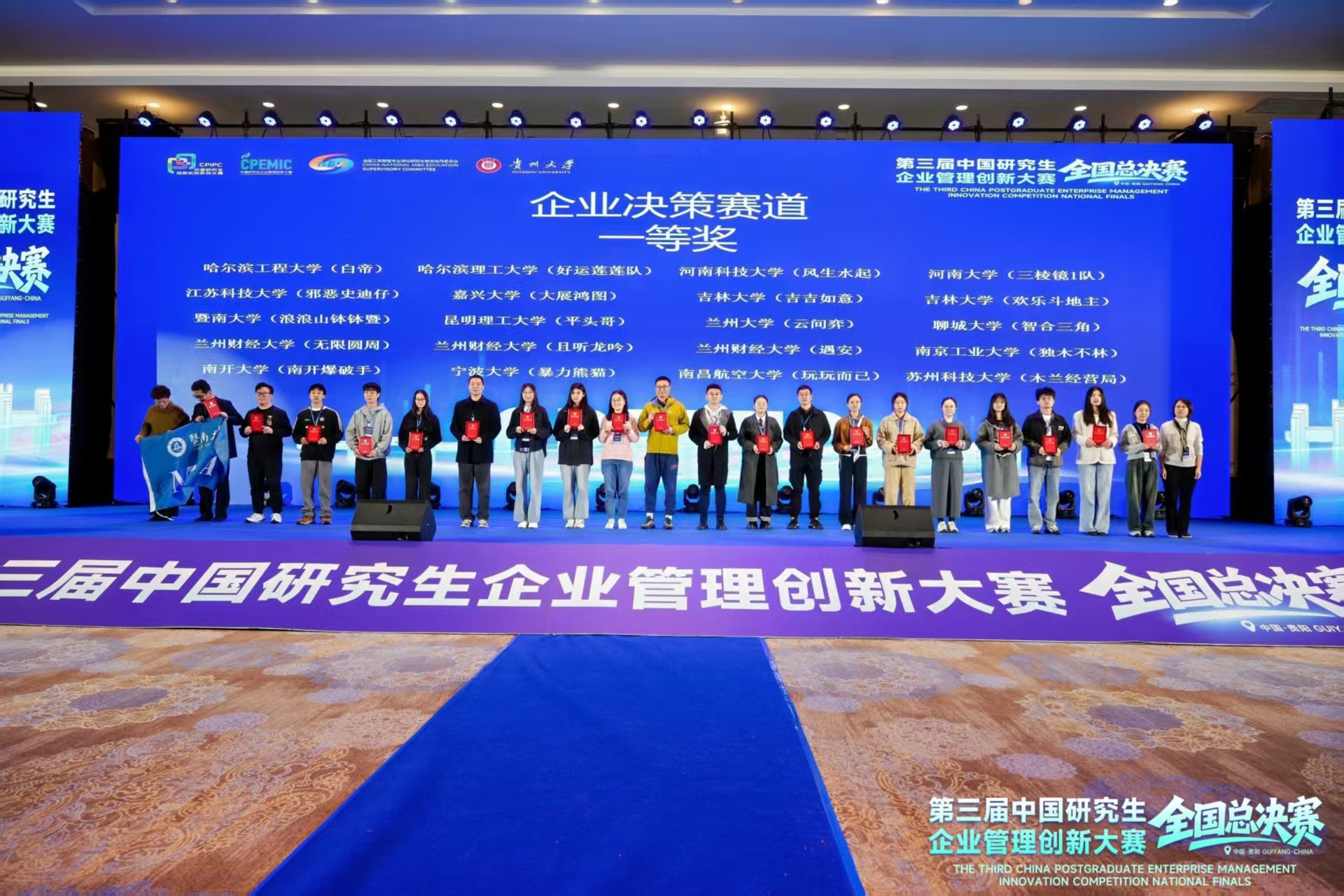 11月7日至9日,第三届中国研究生企业管理创新大赛全国总决赛在贵阳举行,必赢官网商学院MBA教育中心组建的“智合三角队”(杨睿、韩亚筱、林琳)和“M&W队”(王继文、岳亚敏、马金萌)在学院副教授焦艳芳的指导下,在企业决策赛道脱颖而出,分别荣获国家一等奖和国家三等奖,实现了必赢官网在该赛事上国家一等奖的突破。
