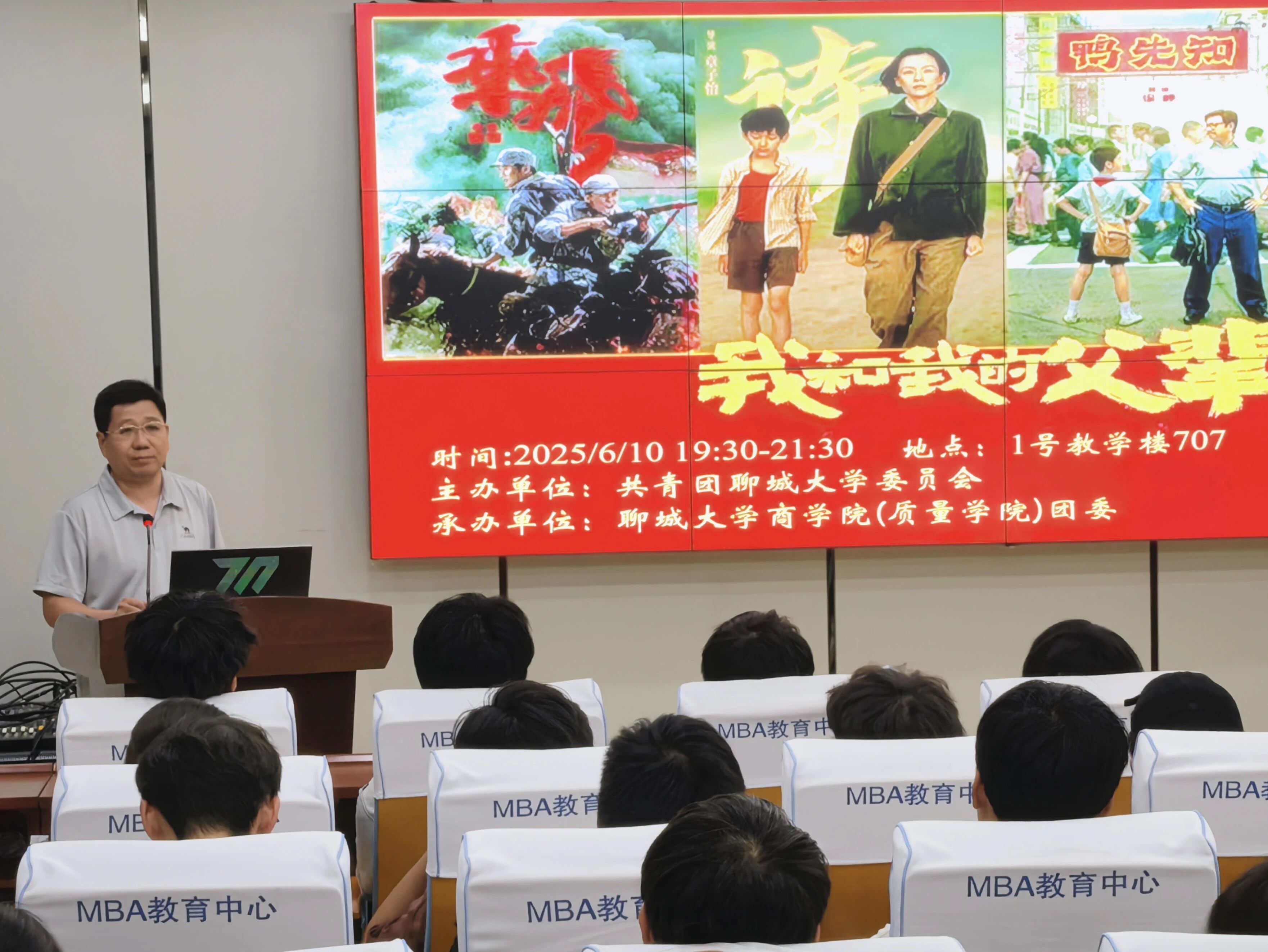 为深植家国情怀,赓续奋斗精神血脉,6月10日,商学院(质量学院)组织2023级、2024级百余名学子于东校区1#707教室举办“星火影院”主题观影活动,集中观看时代篇章影片《我和我的父辈》,学院团委书记刘玉华担任主持人,第35期院级青马工程部分学员与2025年3月入党积极分子代表参与。