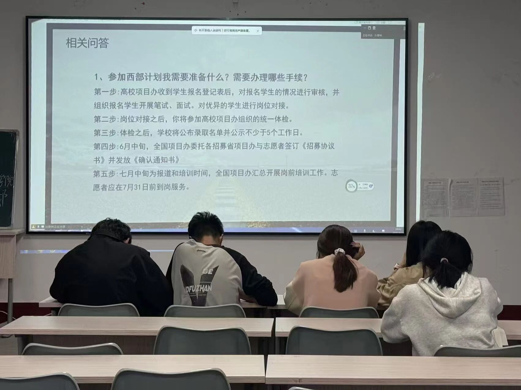 宣讲会在一部充满温度与力量的西部计划纪实影片中启幕。镜头掠过广袤无垠的戈壁滩,聚焦志愿者在乡村搭建智慧农业大棚、于高原卫生院为牧民义诊的忙碌身影,生动呈现青年用科技赋能边疆发展的时代图卷。孙意祥从项目服务国家战略的宏观定位,到支教、支医、支农等具体服务内容,再到严格的选拔流程层层递进,深入剖析了西部计划政策体系,并运用数据模型,将历年岗位分布与职业发展路径以可视化形式呈现,让西部计划的发展脉络清晰可见。在此基础上,孙意祥围绕保障机制,精心制作了国家相关的政策对比表,细致入微地解读了生活补贴、考研加分等福利政策,进一步点燃了同学们奔赴西部的热情与信心。