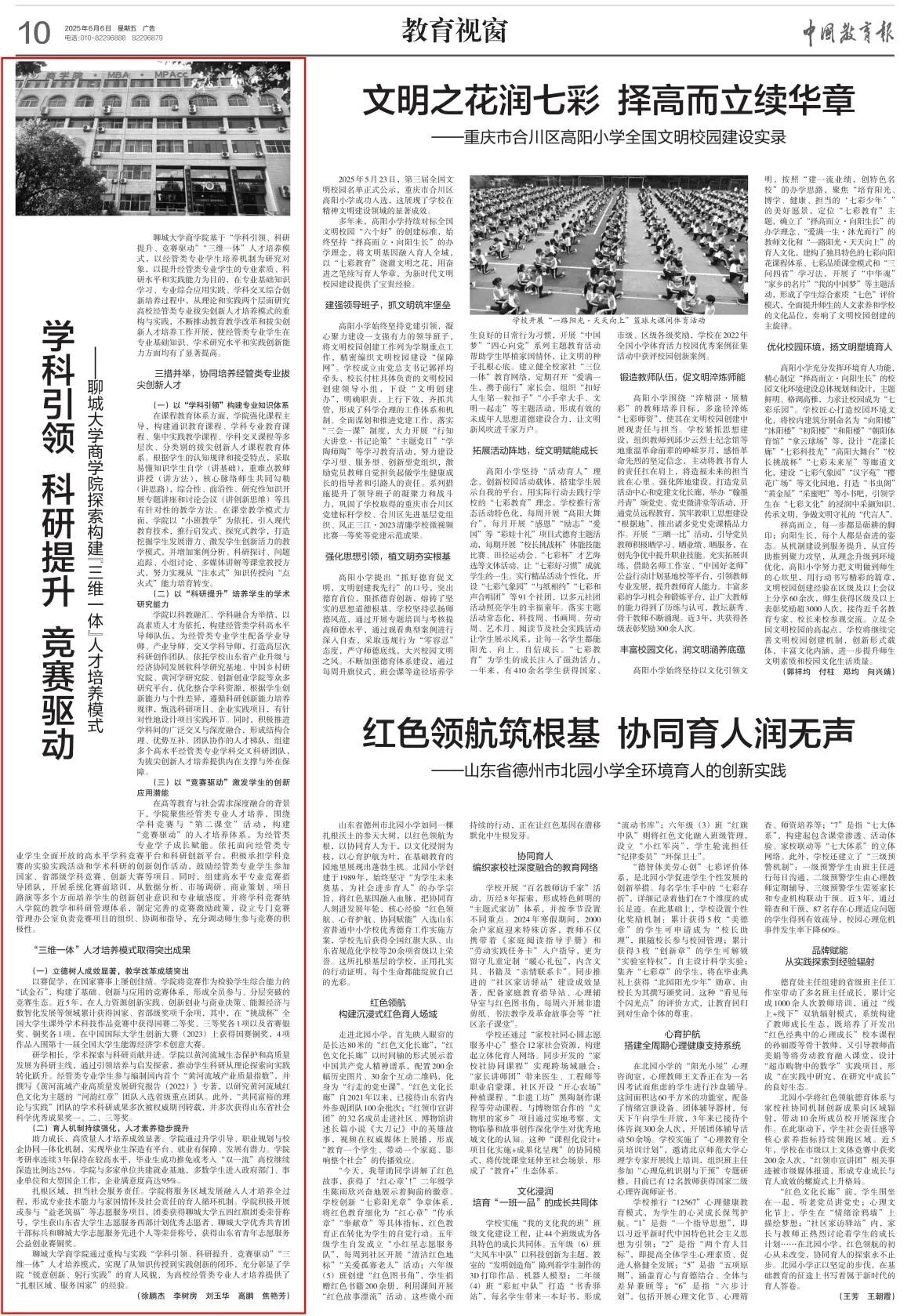 6月6日,《中国教育报》第10版“教育视窗”版面以《学科引领 科研提升 竞赛驱动——必赢bwin线路检测中心探索构建“三维一体”人才培养模式》为题,报道了必赢官网商学院探索构建基于“学科引领、科研提升、竞赛驱动”三维一体协同发展的人才培养体系,着力培养经管专业高素质创新人才的做法,展现其在推动教育教学改革和拔尖创新人才培养方面的成效。