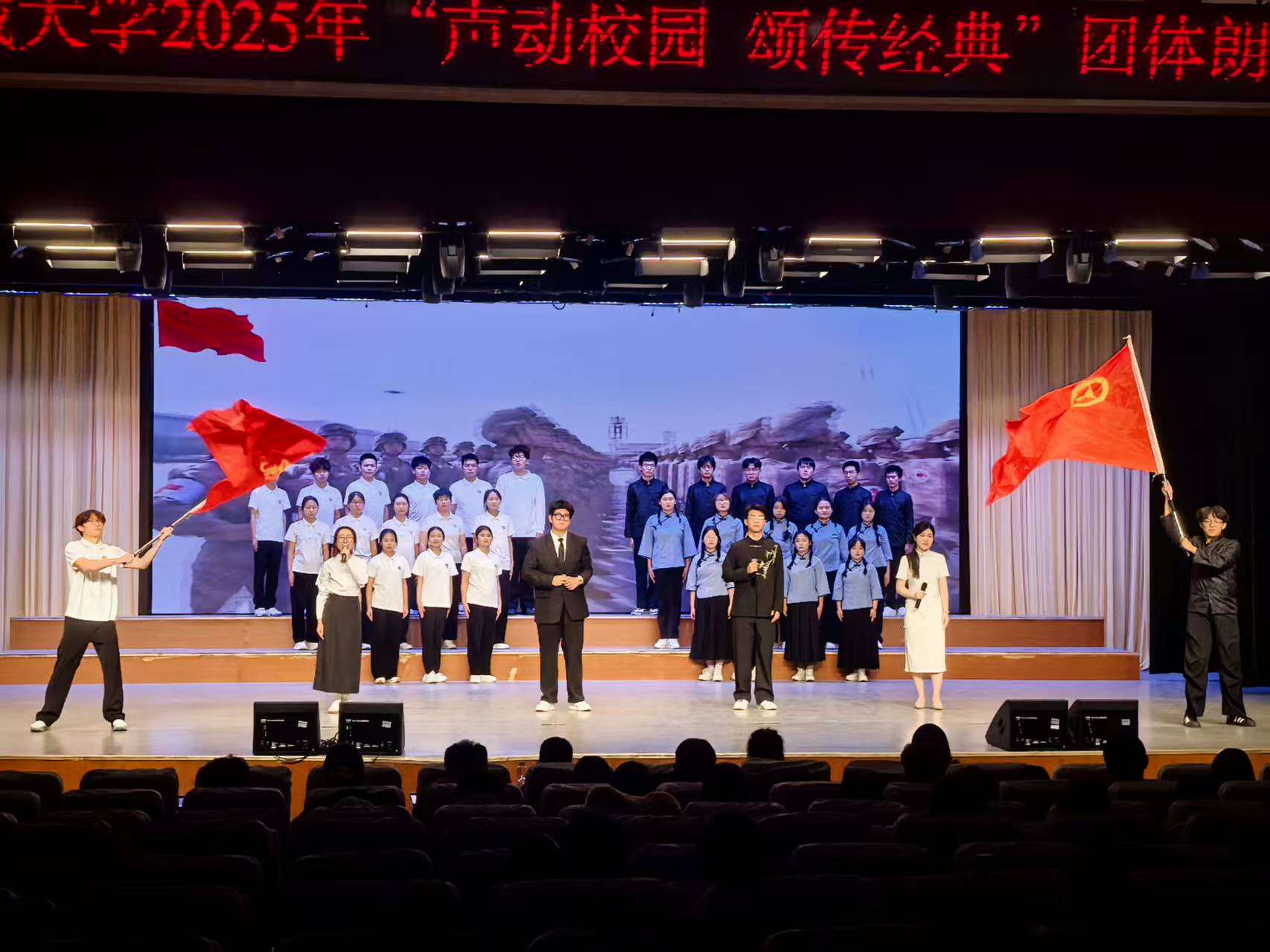本届大赛以“声动校园,颂传经典”为主题,吸引了全校23个学院近800名同学参与。比赛分为初赛、决赛两个阶段,要求选手在规定时间内完成作品朗诵,综合考察语言表现力与情绪感染力。备赛期间,学院积极开展院内选拔赛组建参赛队伍,组织参赛选手利用课余时间进行发音训练、情感揣摩与舞台站位排练,力求呈现独具匠心的朗诵作品。